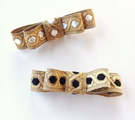Little girls can never have too many bows!  This Limited Edition vintage metallic ribbon tuxedo style double bow would be a lovely addition worn casual or dressed up for any special occasion.