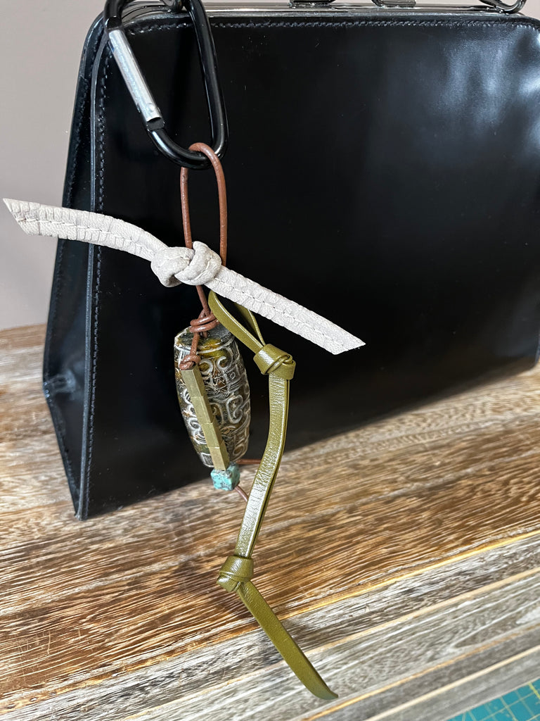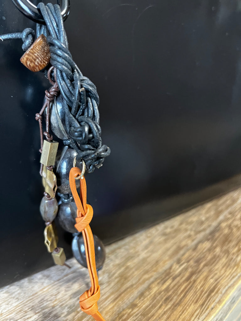 Transform your bag into a statement piece with this handcrafted handbag charm. Each unique design is meticulously hand-knotted on leather cord, combining carved horn and jade beads with warm wood accents, authentic African brass, and supple lambskin leather. The refined black and silver carabiner ensures secure attachment while adding a touch of understated luxury. A truly one-of-a-kind accessory for those who appreciate artisanal quality and timeless design.