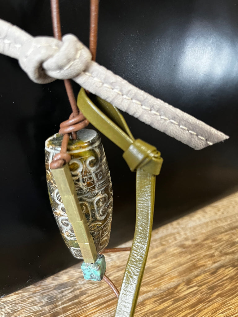 Carved Jade & Olive Leather 10"L